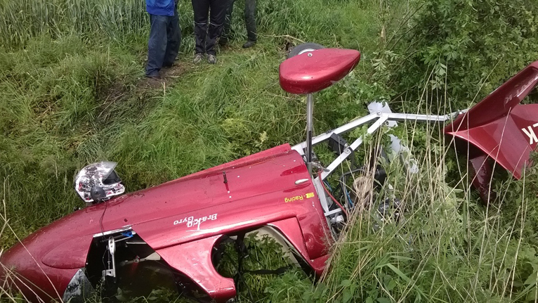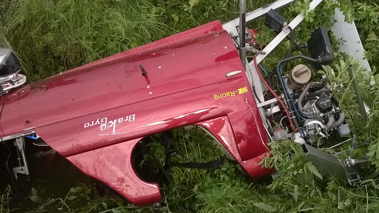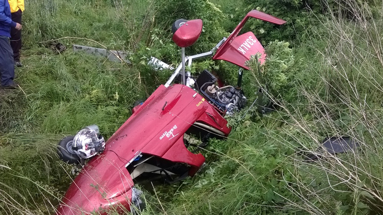 Podczas próby wzbicia w powietrze silny podmuch zepchnął maszynę do strumyka. Samolot przewrócił się kołami do góry i uwięził pilota pod wodą.