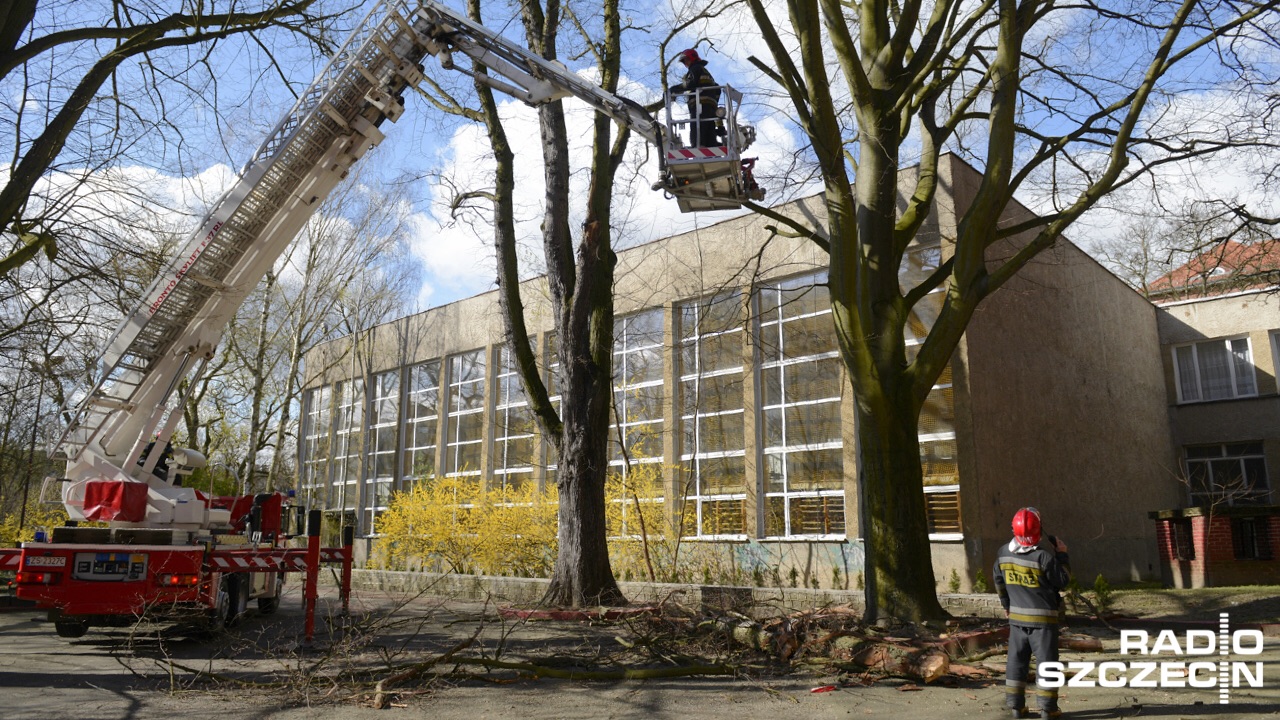 - Rano zauważyliśmy, że na jednym z drzew jest ułamany suchy konar. Oparł się o drugie drzewo, więc stwarzał niebezpieczeństwo, bo tutaj przechodzi młodzież, około 700 uczniów - mówi Agnieszka Czupryniak, kierownik administracji w Zespole Szkół Budowlanych.