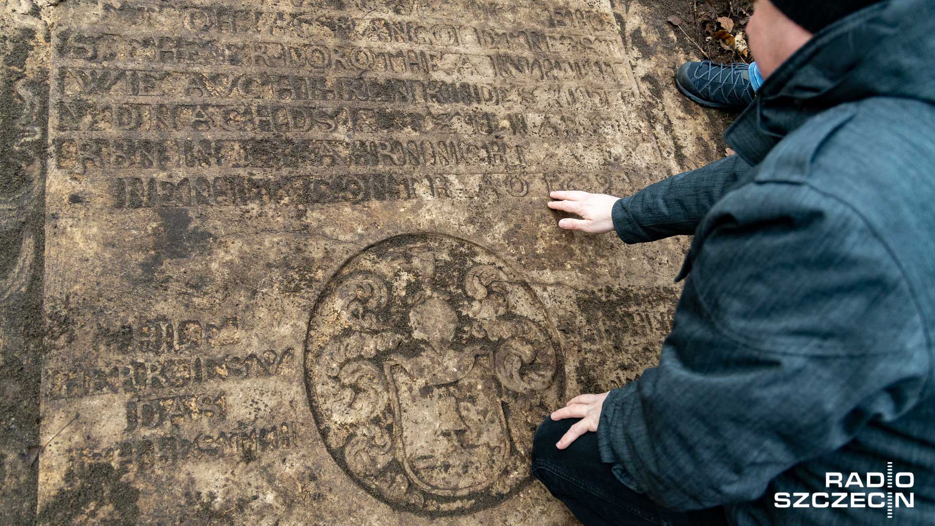 - Słuchajcie, 1699 rok! - ta data na odsłanianej z ziemi i liści płycie zadziwiła wszystkich, przyznaje Marek Łuczak. - Tu jest skrótowo zapisywane, więc jest to łaciną, pochowany jest tu Johann Jacob Mangoldt i jego żona - odczytuje z płyty Łuczak.