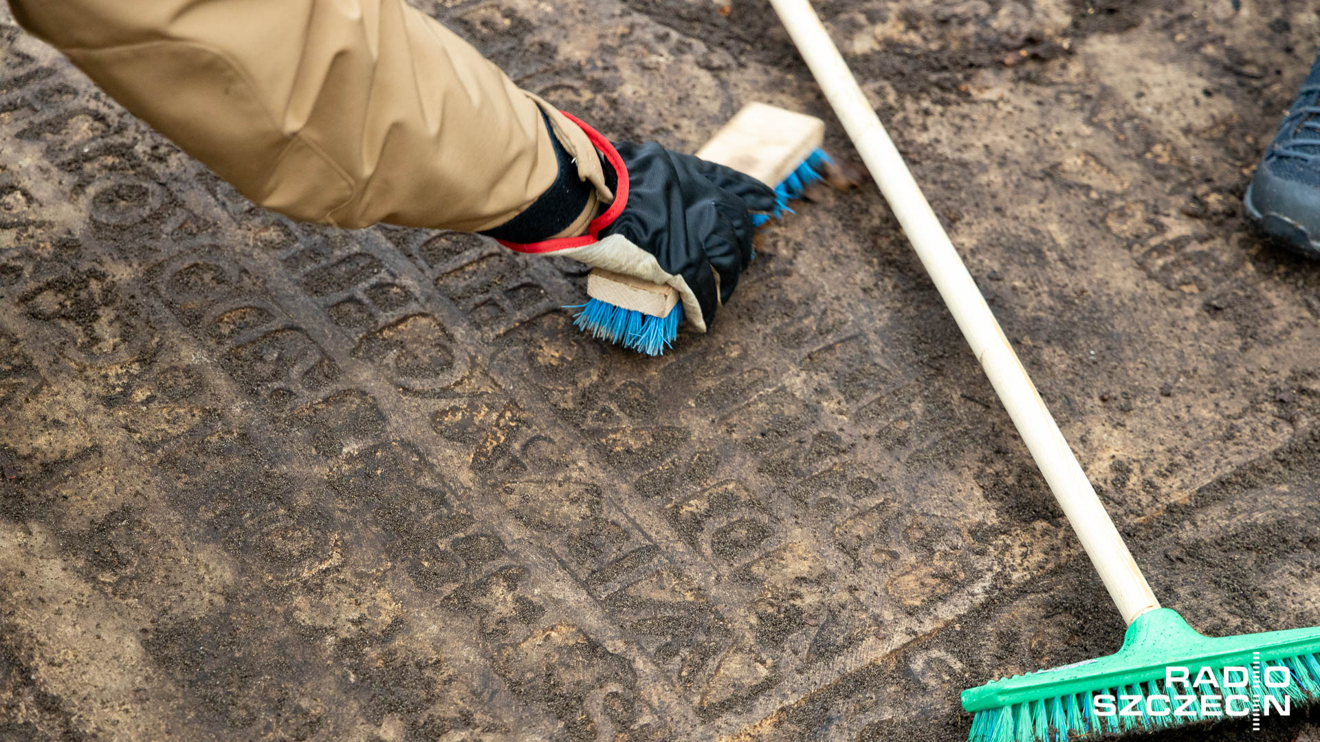 Marek Łuczak z ekipą wolontariuszy znalazł XVII-wieczną płytę nagrobną znanego szczecińskiego ludwisarza. Fot. Robert Stachnik [Radio Szczecin]