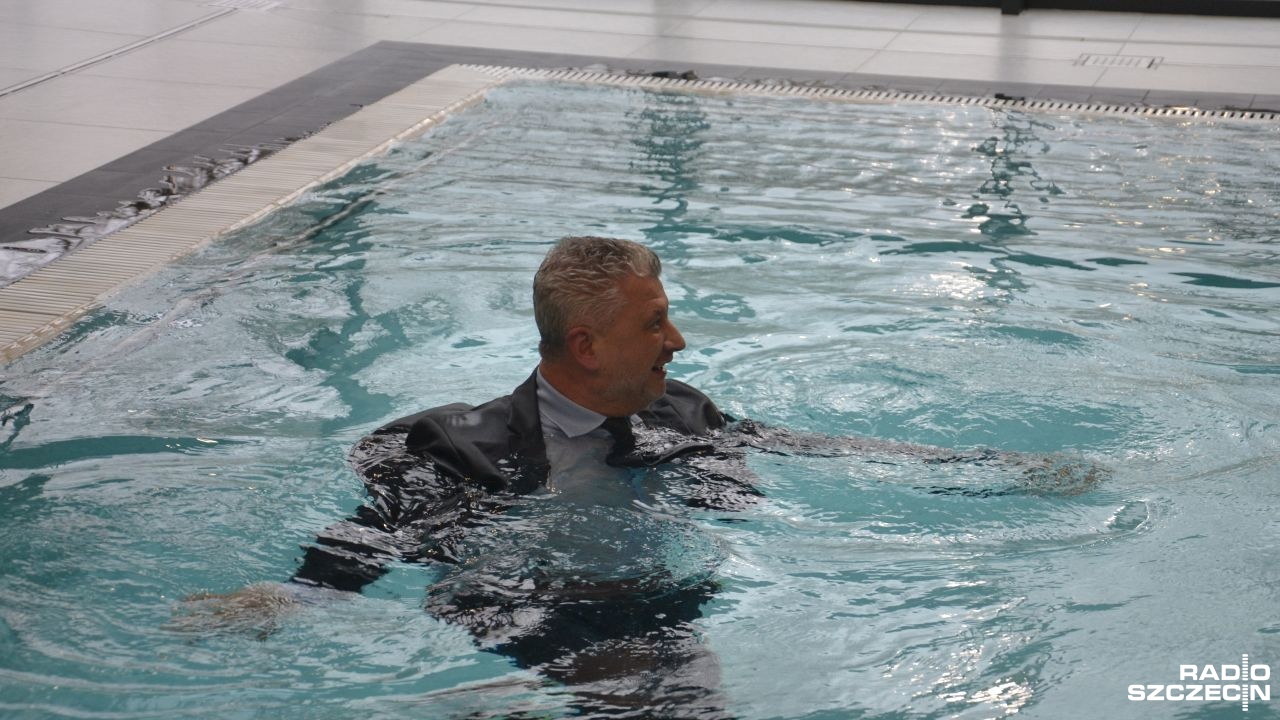 Jako pierwszy do nowego basenu wskoczył Jacek Pawłowicz, wiceprezes Uzdrowiska Połczyn.