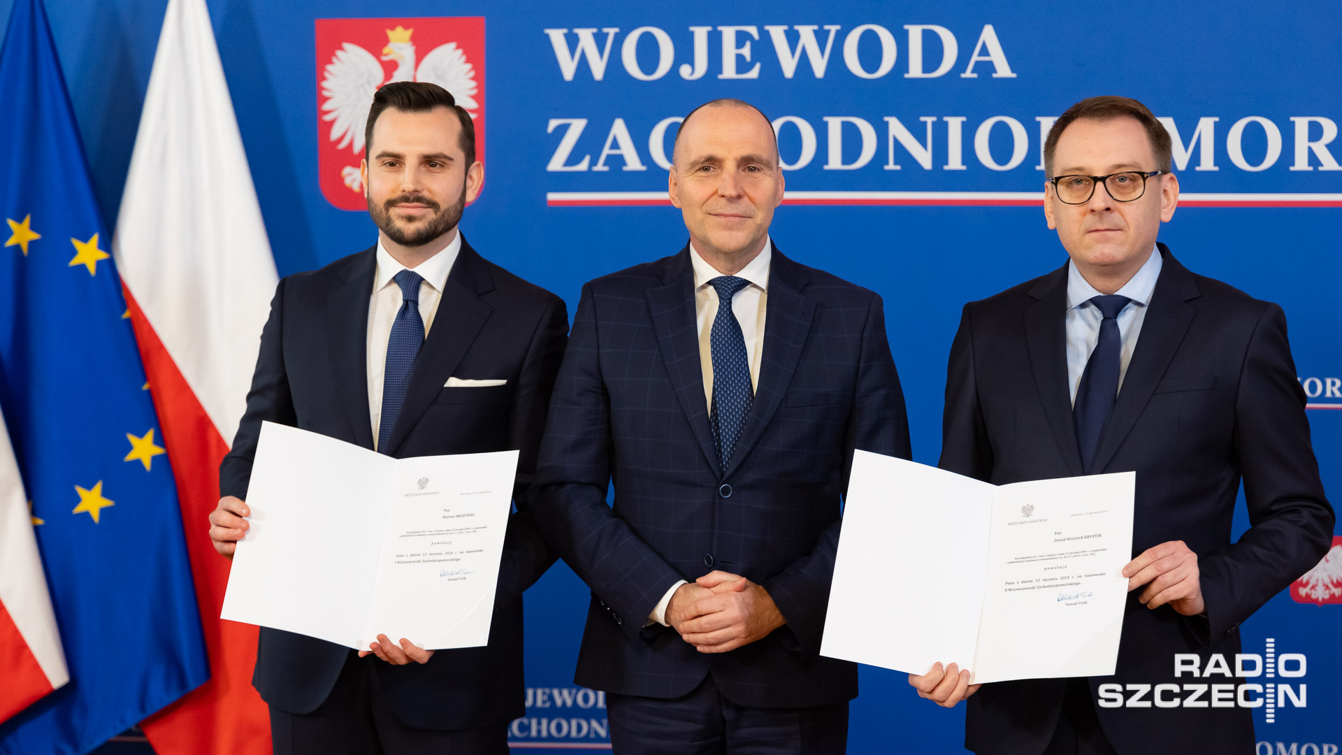 Premier powołał nowych wicewojewodów zachodniopomorskich - nominacje odebrali w środę Dawid Krystek - dotychczas jeden z dyrektorów szpitala przy Strzałowskiej w Szczecinie, a także szef Nowej Lewicy w mieście i były radny SLD - oraz Bartosz Brożyński, radca prawny, nauczyciel akademicki i były dyrektor biura posła PO, Arkadiusza Marchewki.