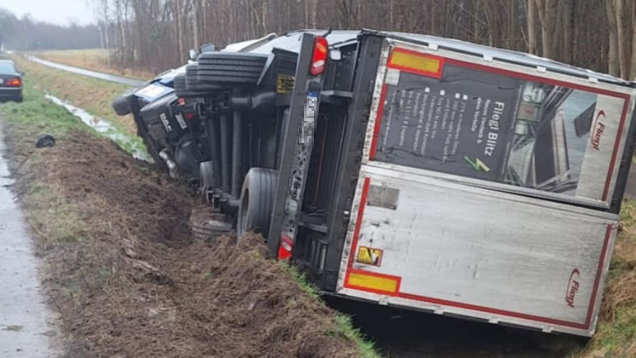Ciężarówka z naczepą zjechała do rowu i przewróciła się na bok.