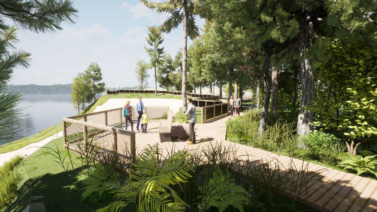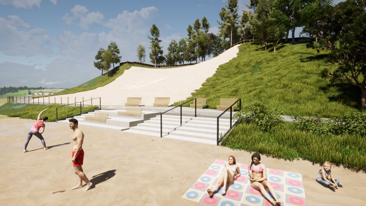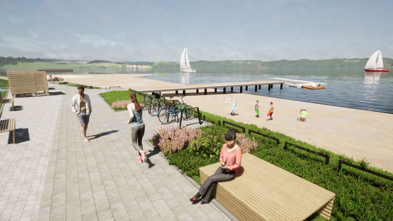 Powstaną również dwa punkty widokowe oraz łącznik komunikacyjny, pomost, schody i oświetlenie. Pojawią się także elementy małej architektury: ławki, stojaki na rowery, przebieralnie, kosze na śmieci, tablice informacyjne oraz balustrady.