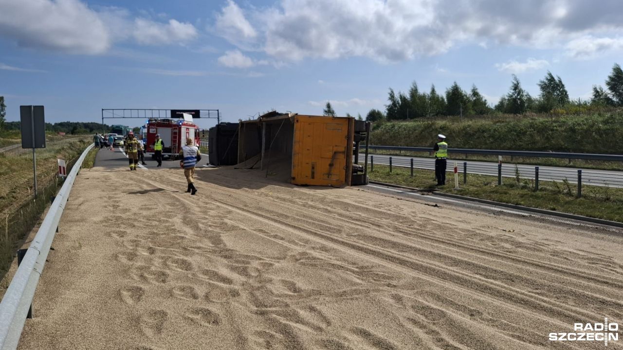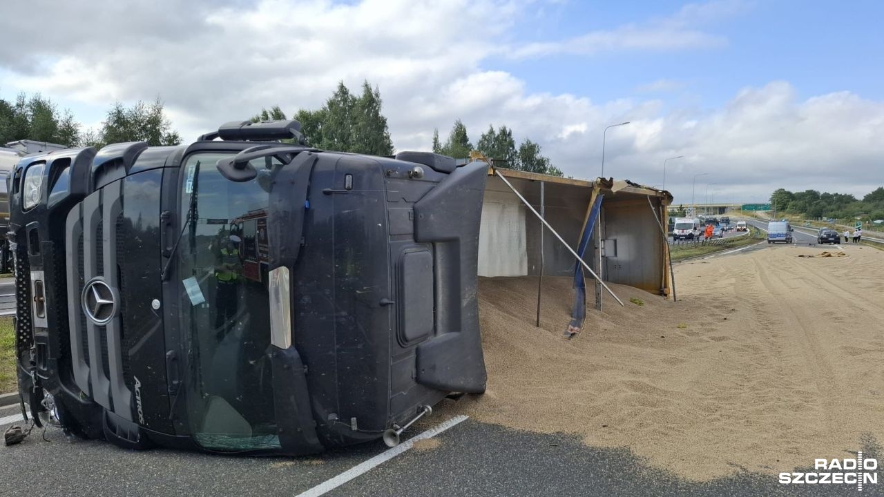 Utrudnienia dla podróżujących drogą ekspresową S6. Pomiędzy węzłami Kołobrzeg Wschód i Ustronie Morskie przewróciła się ciężarówka przewożąca zboże.
