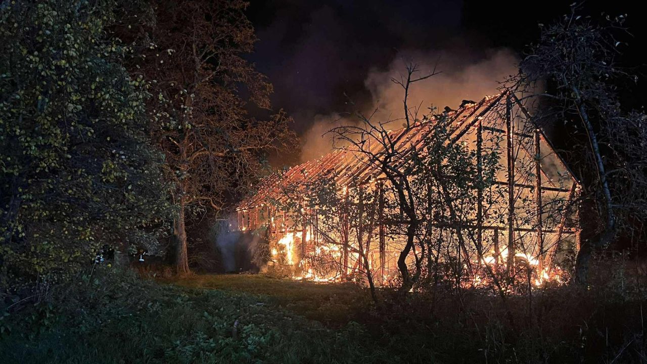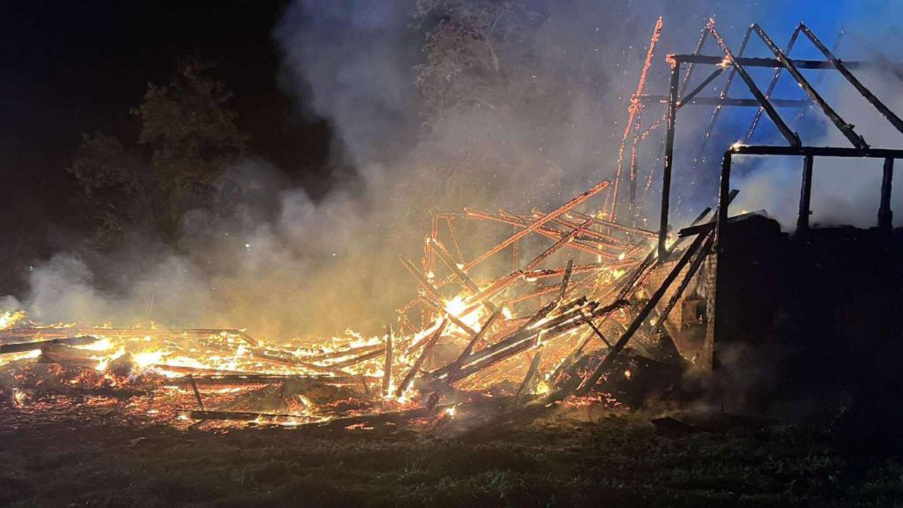 Płonie stodoła w miejscowości Unieradz w gminie Siemyśl. Ogień objął całą konstrukcję i rozprzestrzeniał się na dużą powierzchnię.