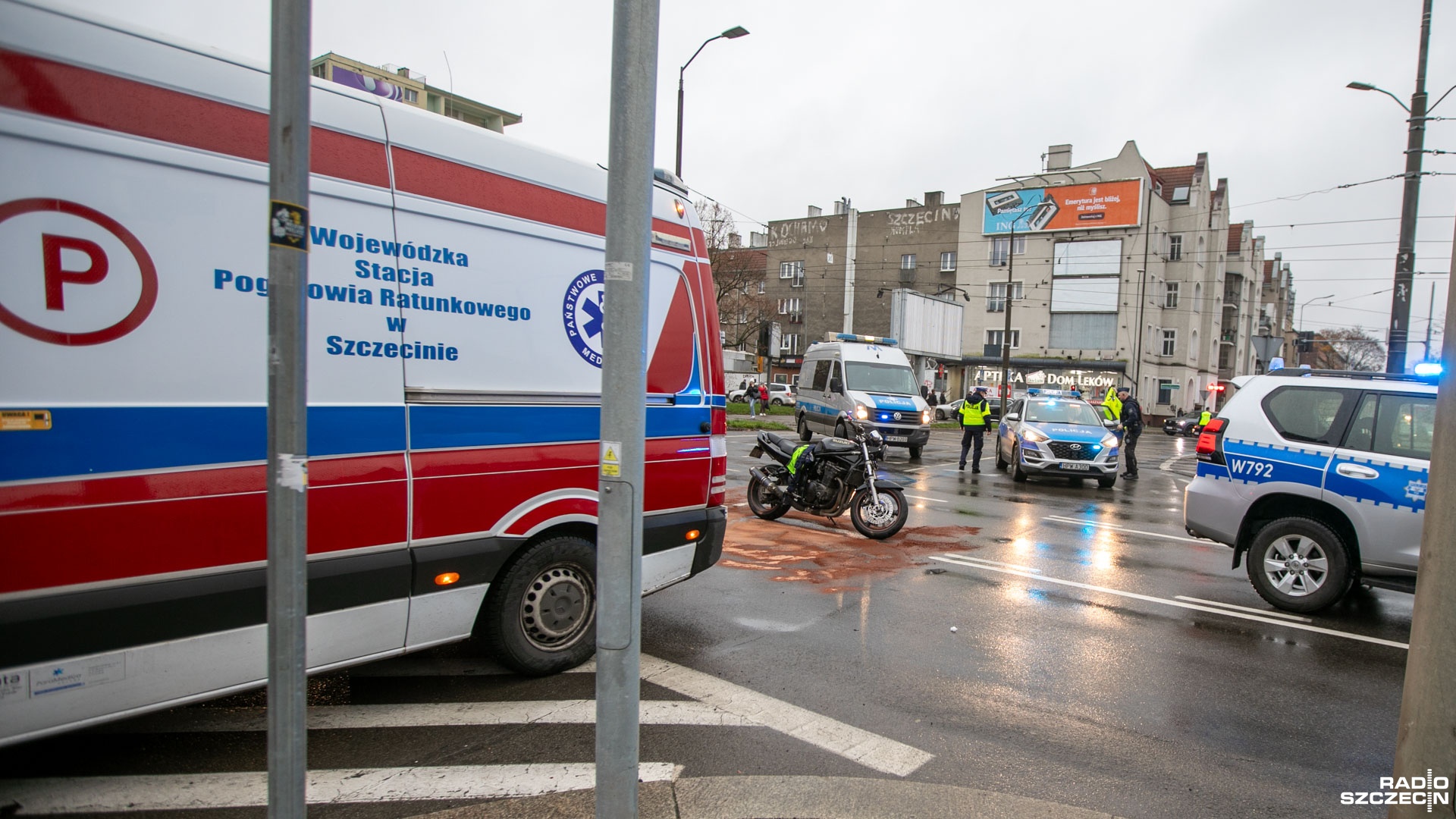 Na skrzyżowaniu al. Piastów z ulicą Krzywoustego zderzyły się samochód osobowy i motocykl.