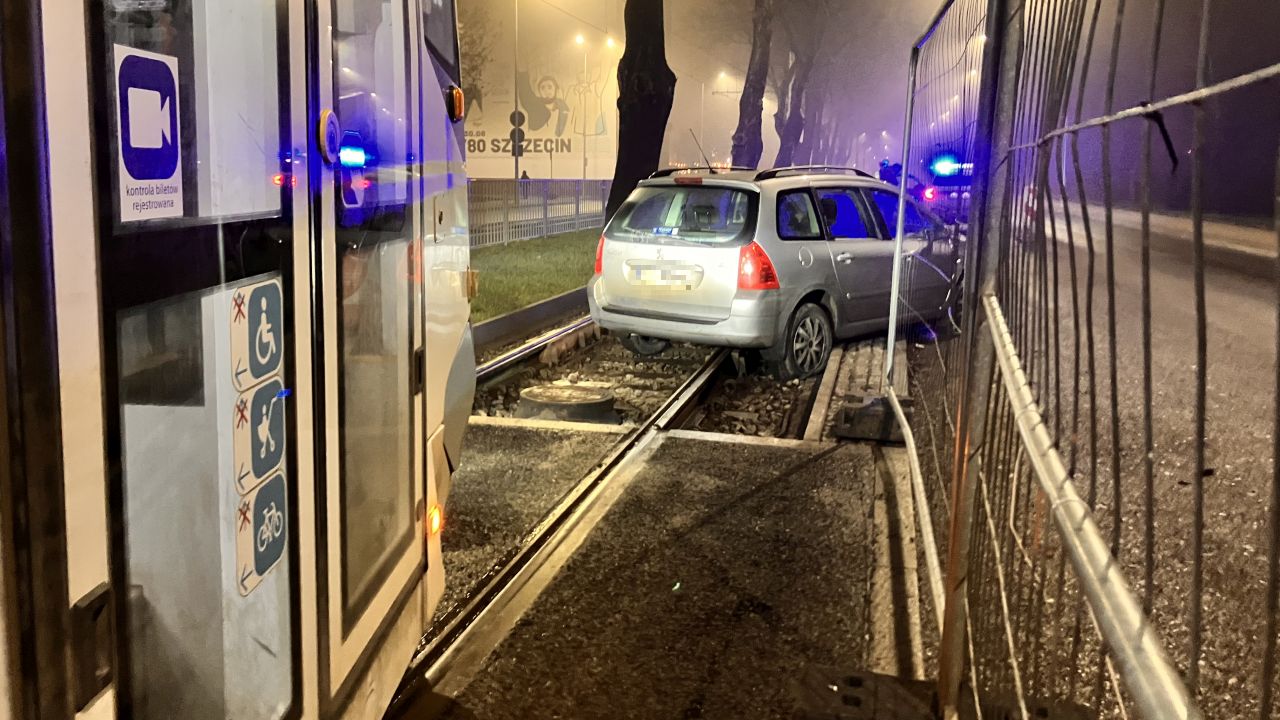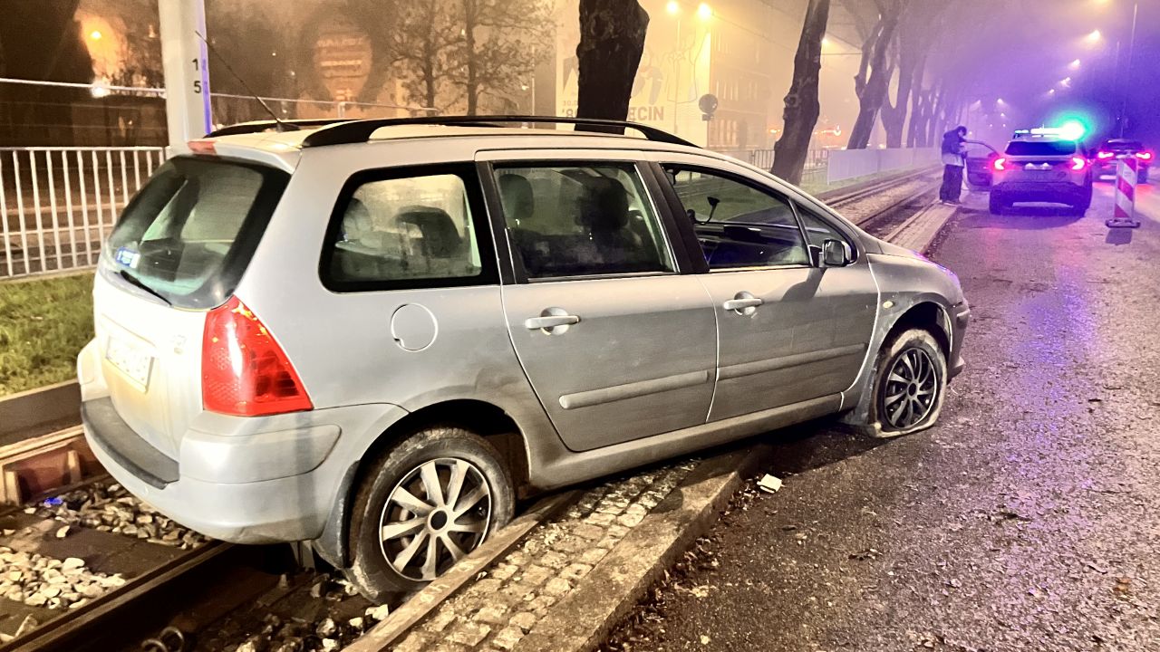 W al. Powstańców Wielkopolskich samochód osobowy wjechał w torowisko. Auto ma poprzebijane opony.