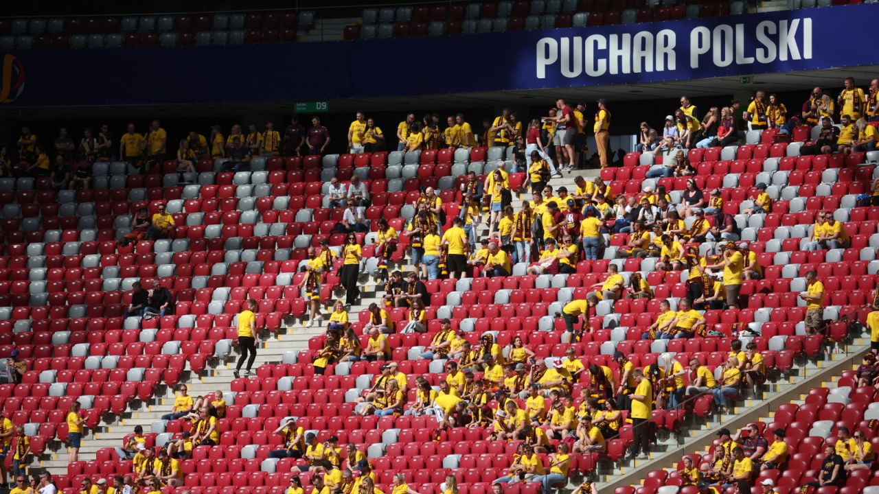 Kibice Pogoni Szczecin powoli zapełniają trybuny PGE Stadionu Narodowego przed finałowym meczem piłkarskiego Pucharu Polski z Legią Warszawa. PAP/Leszek Szymański