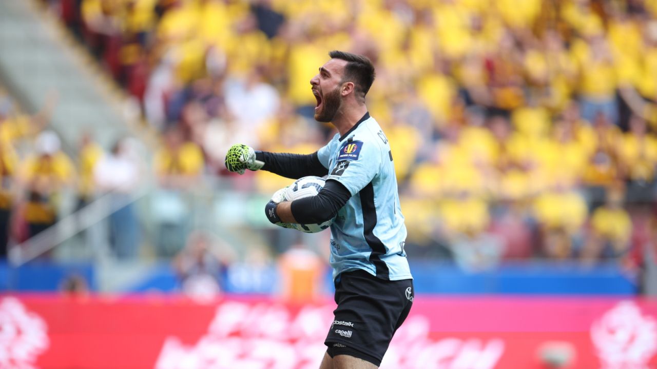 Bramkarz Pogoni Szczecin Valentin Cojocaru cieszy się po wybronieniu rzutu karnego podczas finałowego meczu piłkarskiego Pucharu Polski z Legią Warszawa na PGE Narodowym. PAP/Leszek Szymański