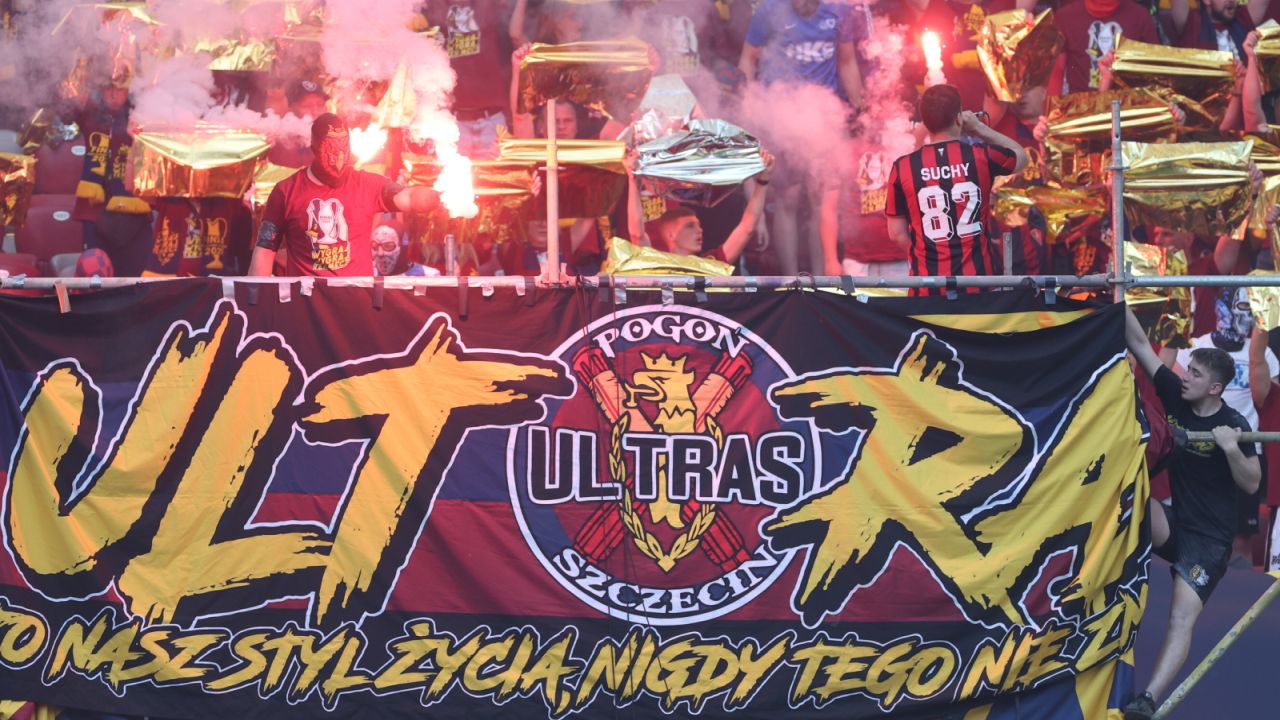 Kibice Pogoni Szczecin podczas finałowego meczu piłkarskiego Pucharu Polski z Legią Warszawa na PGE Narodowym. PAP/Leszek Szymański