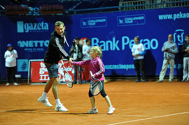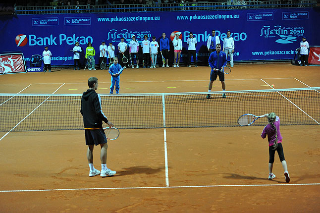 Mistrzowie uczyli młodych adeptów tenisa, a w finale wieczoru rozegrali pokazowy mecz z gwiazdami Turnieju Artystów.