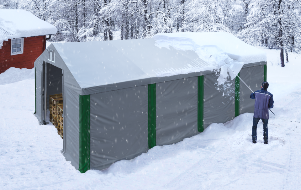 Śnieg zalegający na dachu hali namiotowej zawsze powinien być regularnie usuwany. Kiedy opady utrzymują się przez kilka dni, a my zwlekamy z odśnieżaniem, może dojść do nadmiernego obciążenia konstrukcji.