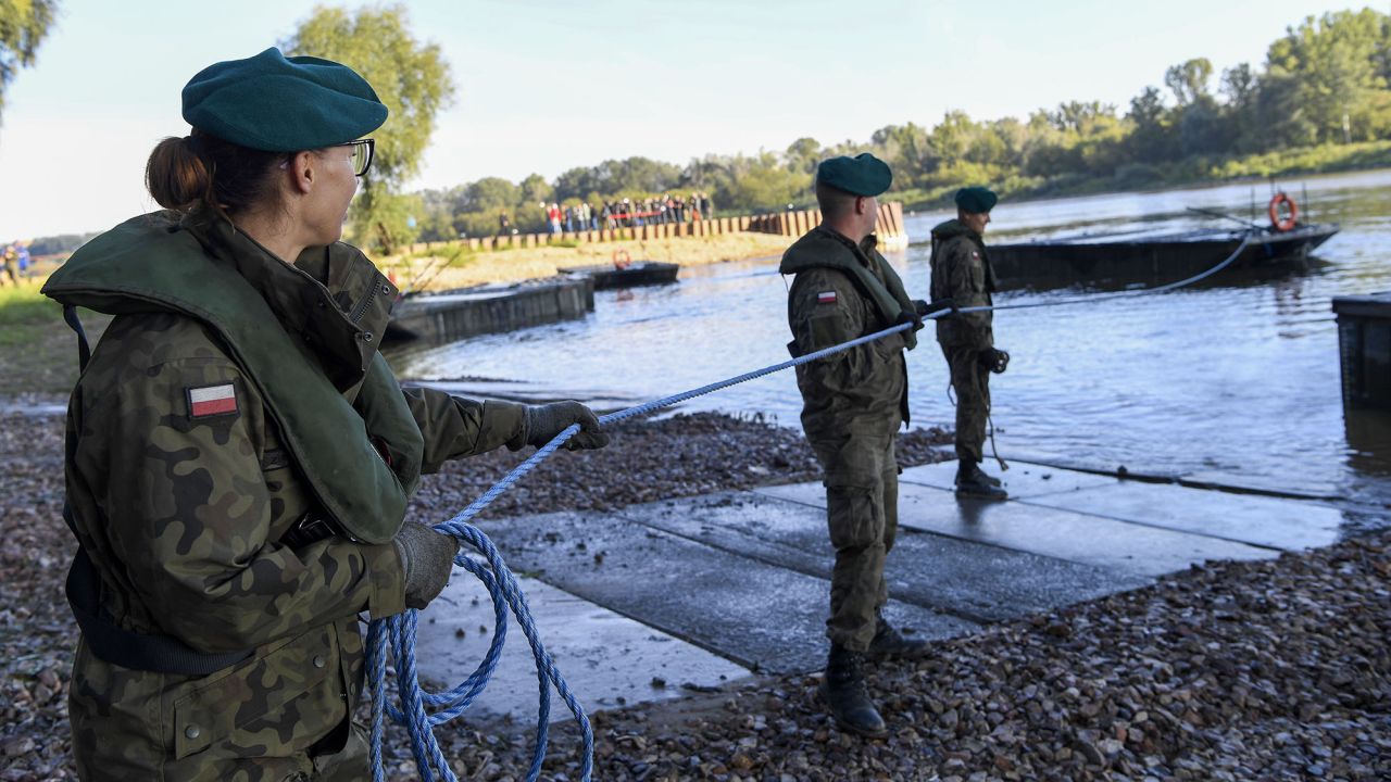 Żołnierze budują w Warszawie most pontonowy na Wiśle. Posłuży on do podtrzymania zastępczego rurociągu, transportującego ścieki do oczyszczalni "Czajka". Elementy mostu mają zostać połączone w całość.
