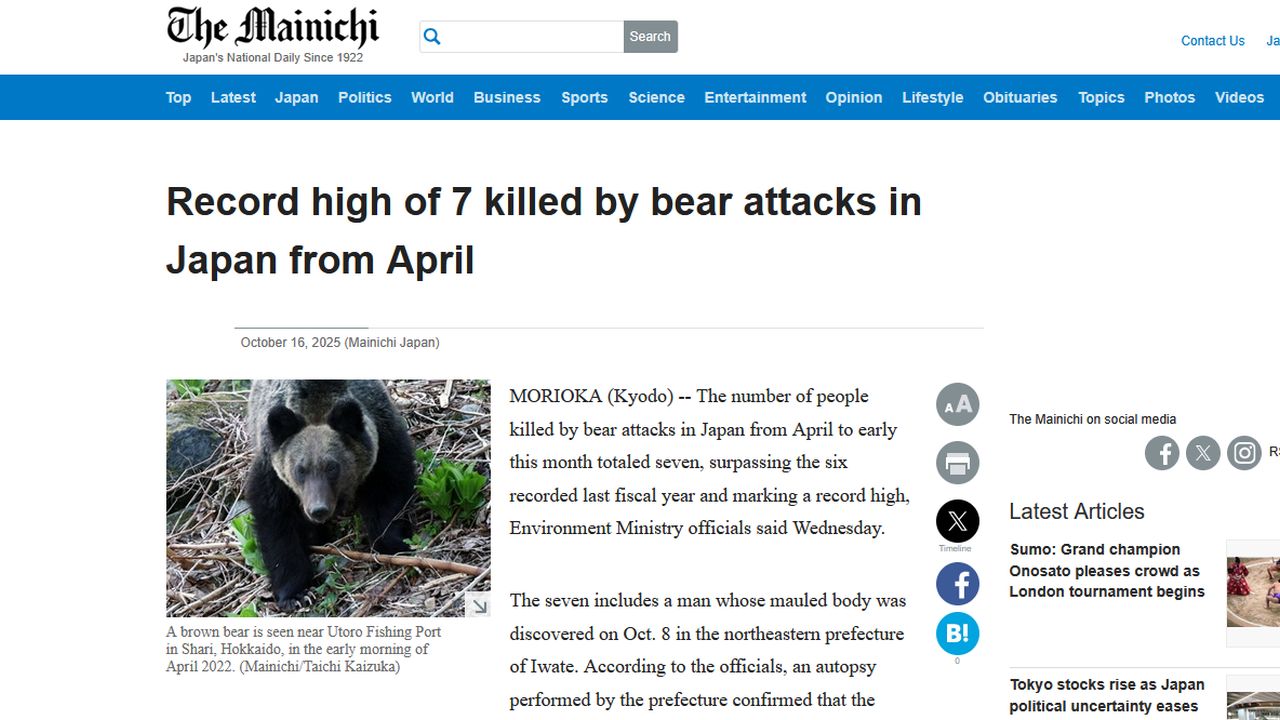 Najnowszą ofiarą śmiertelną jest mężczyzna, którego okaleczone ciało znaleziono 8 października w prefekturze Iwate na wyspie Honsiu. Jak potwierdziła sekcja zwłok, zginął on w wyniku ataku niedźwiedzia podczas zbierania grzybów.