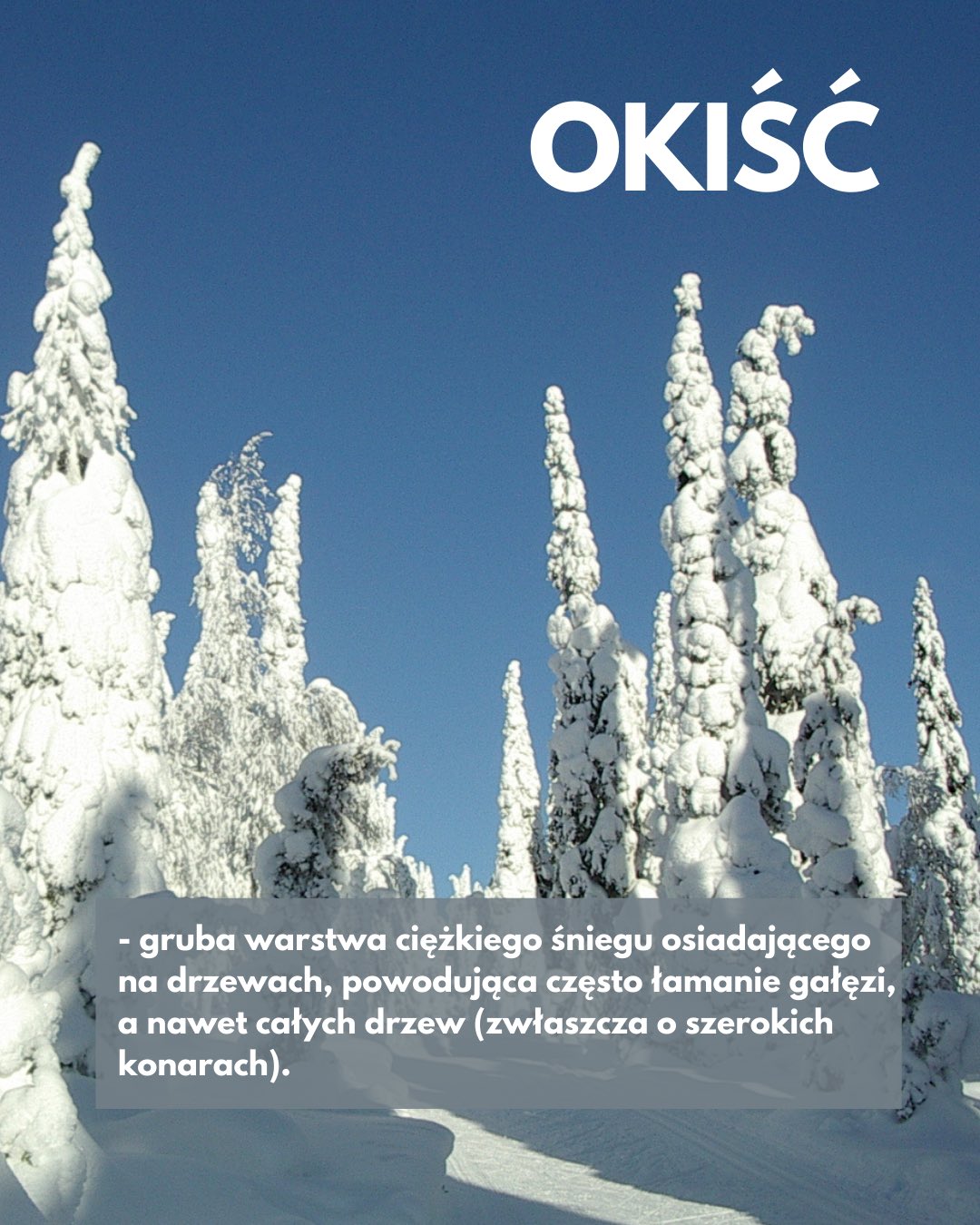Wśród zimowych słów zaprezentowanych przez Towarzystwo Krajoznawcze Krajobraz można znaleźć m.in. śryż, czyli skupisko gąbczastych bryłek utworzonych z kryształków lodu. Tworzy się on w wodzie rzecznej w temperaturze poniżej 0 st. C. To też początkowy etap formowania się pokrywy lodowej na rzece. Z kolei okiść oznacza grubą warstwę ciężkiego śniegu, osiadającego na drzewach, powodującą często łamanie gałęzi, a nawet całych drzew.